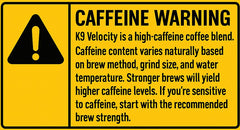 K9 Velocity is a high-caffeine coffee blend. Stronger brews yield higher caffeine levels.